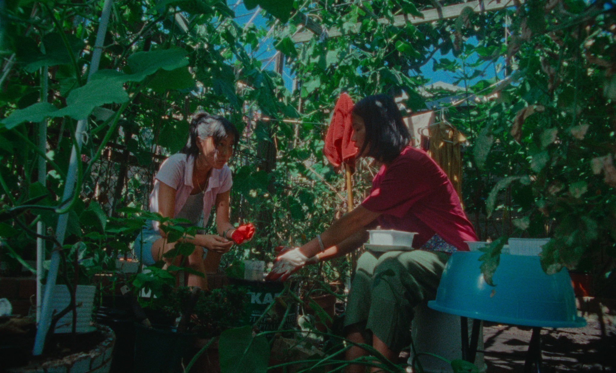 I came to know Jess X. Snow first as a muralist and a poet before seeing any of their films. I’m glad this was my entry point because it gave me insight into their vision. First, Snow brings to cinema a painterly sensibility, an eye for composition, color, space, and the organic relationship between human and nonhuman characters. Their films are visually stunning but shorn of grandeur and adornment—natural, even in moments suffused with magical realism. And yet Snow manages to make images that are simultaneously intimate and monumental—not unlike their murals. Second, they are poetic. The dialogue in their films is economical yet transcendent, written and delivered in the cadence of breath. Interiority breaks through the mundane, naked and free from the constraints of the English language and the spoken word. There is intimacy without sentimentality.
